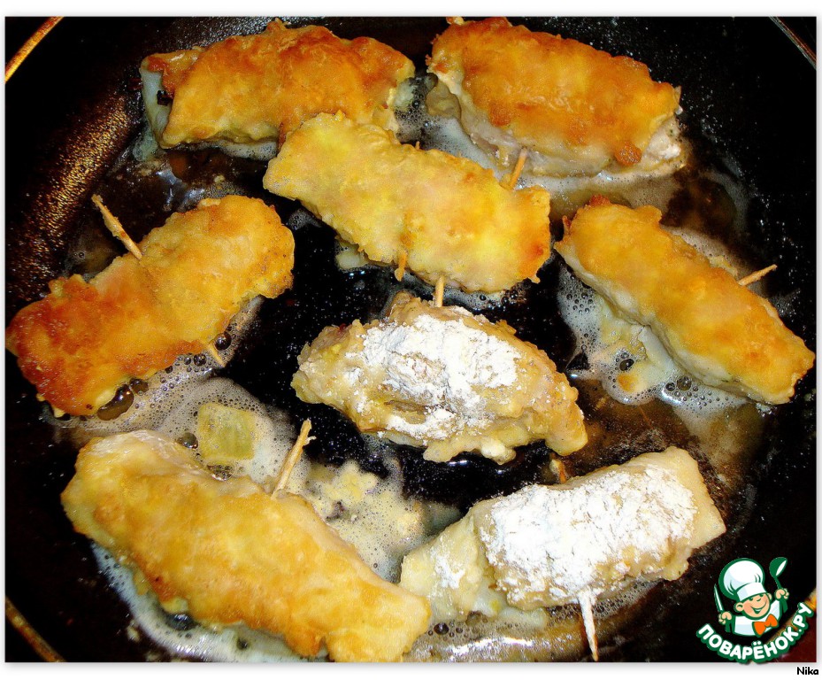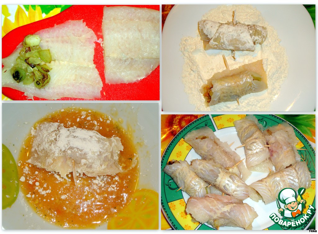 Лук выложить на край филе и аккуратно закрутить в рулетик. Чтобы рулетики не раскрутились, я их скрепила зубочистками. Очень удобно держать рулетики одной рукой с двух сторон за зубочистку и переворачивать, чтобы обвалять в муке, затем в яйце и снова в муке (такой способ обвалки был в рецепте у Русички). Для обмакивания, яйцо смешать вместо соли с солёной приправой.