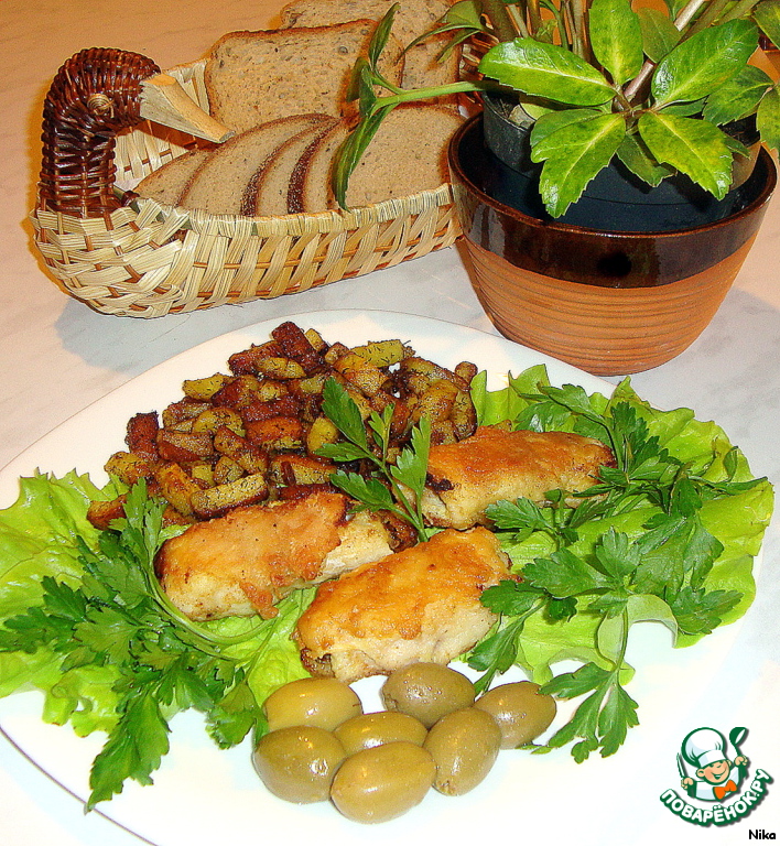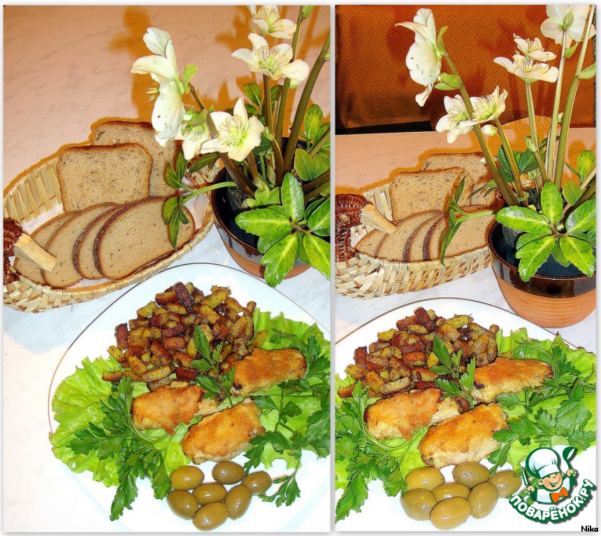 К рулетикам я поджарила картофель, добавив сухой укроп. Соль везде заменила приправой.