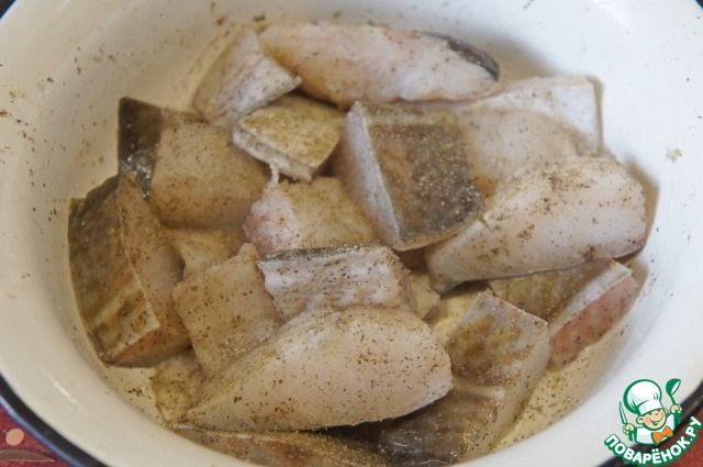 Рыбу почистить, промыть, нарезать на порционные куски. Посолить, поперчить и приправить по вкусу, сбрызнуть лимонным соком и отставить.