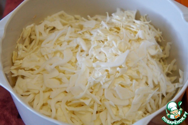 Накрыть оставшейся капустой, сбрызнуть растопленным маслом