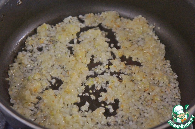 В сотейнике разогреть растительное масло, всыпать измельченный лук, обжарить до золотистого цвета.
