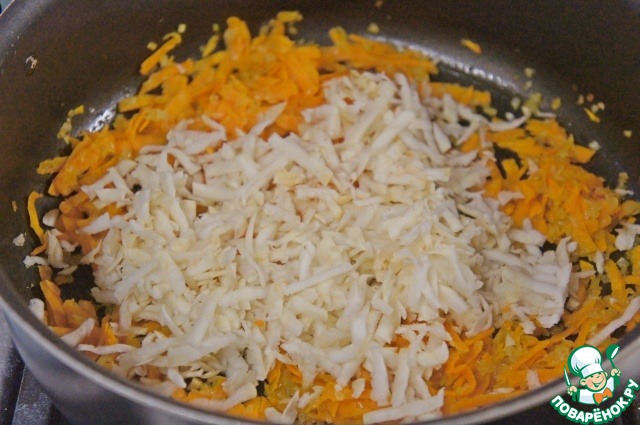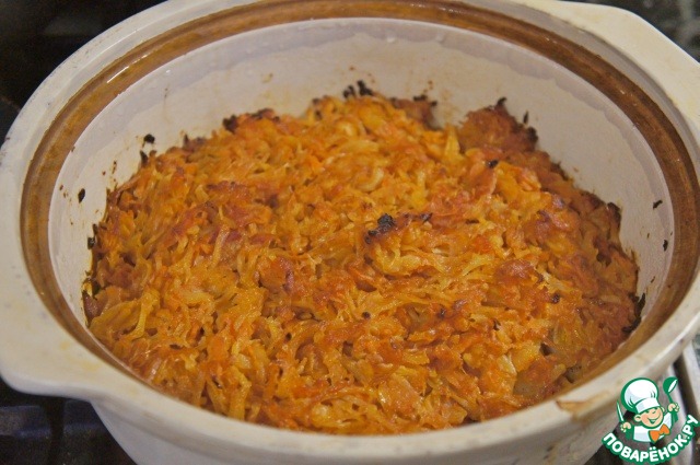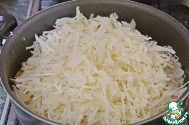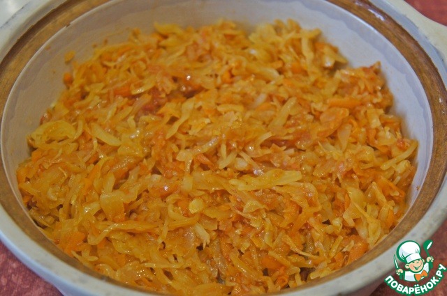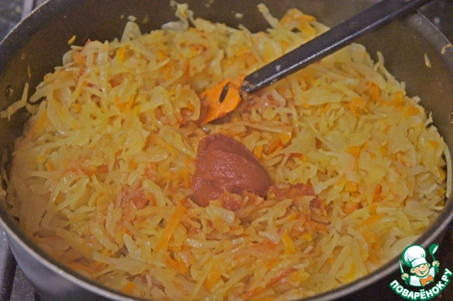 Добавить капусту и тушить до готовности капусты. Посолить и поперчить по вкусу.