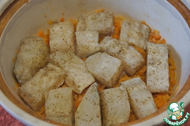 В форму для запекания выложить часть капусты, сверху уложить кусочки рыбы,