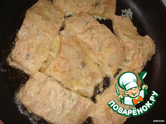 Обваливаем рыбу в муке, затем в яйце и жарим.