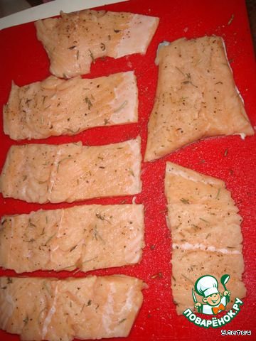 Филе нарезать на порционные куски, посыпать солью, смесью перцев, розмарином и тмином.