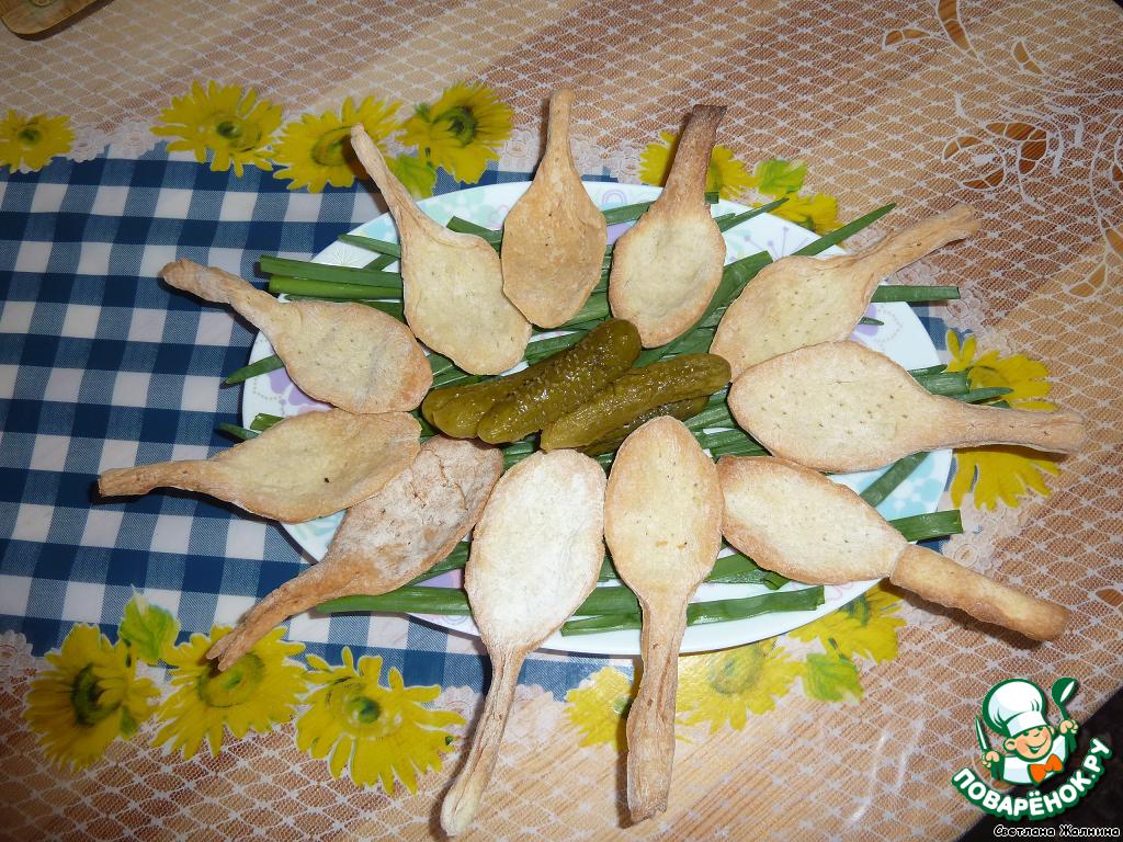 Пока готовится рыба, делаем съедобные ложки. Слоеное тесто (я взяла готовое магазинное) слегка раскатать и вырезать по трафарету столовых ложек
