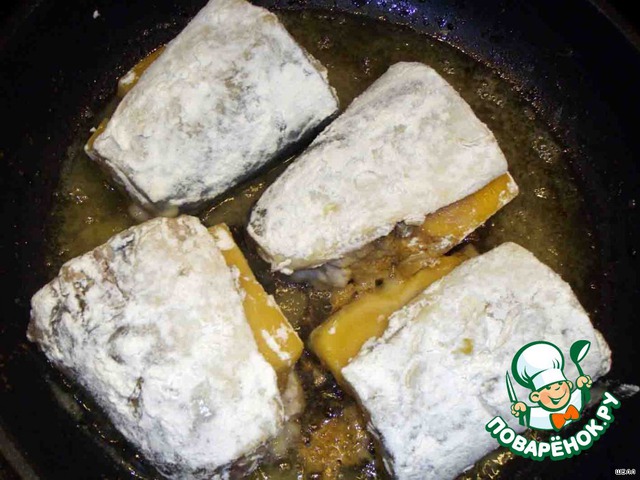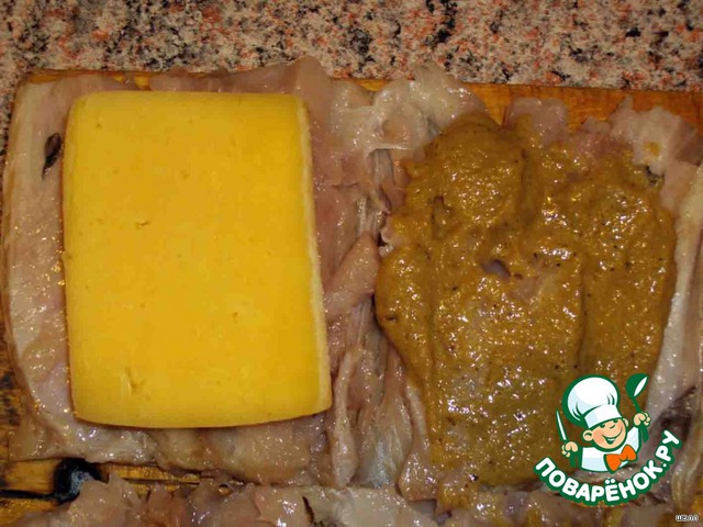 на каждый кусочек рыбы кладем - на одну половинку кусочек сыра, вторую половинку намазываем горчицей.Складываем обе половинки вместе. Так проделываем со всеми кусочками.