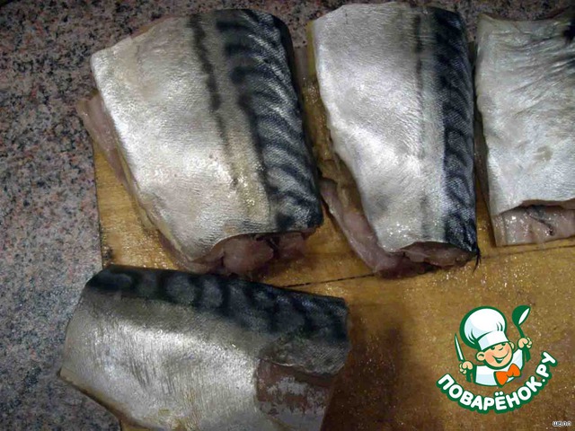 каждую тушку скумбрии режем пополам (если рыба крупная - то на 3 части)