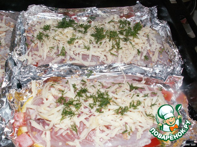 посыпать приправой для рыбы, перцем, посыпать сыром и мелко порезанным укропом.