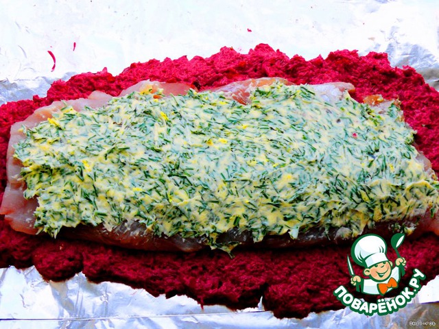 На рабочую поверхность положить немного внахлест фольгу, чтобы получился квадрат (если фольга тонкая – лучше сложить листы вдвое). На фольгу выложить половину свеклы, на нее 1 филе, по рыбе размазать масло.