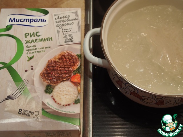 Наливаем в кастрюльку воду, добавляем соль (1/2 ч. л.), ставим на огонь и доводим до кипения. Пакетики с рисом Жасмин кладем в кипящую воду и варим на медленном огне 15 минут.