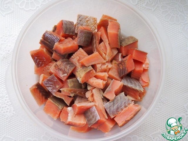 Пока варится рис, приготовим рыбные мини-тортики. Филе горбуши нарезать.