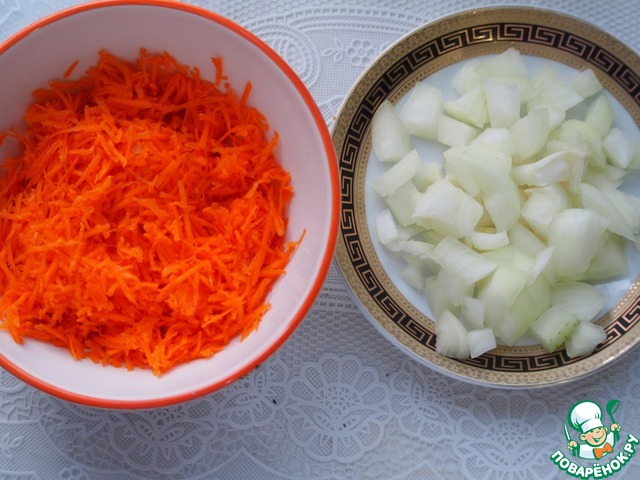 Лук и морковь почистить, помыть. Лук нарезать кубиками, а морковь натереть на мелкой терке.