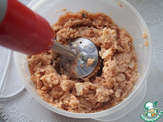 Лук добавить к горбуше и измельчить с помощью блендера.