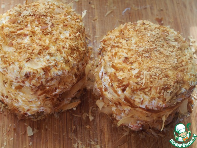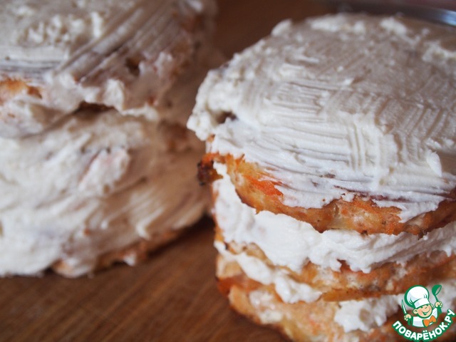 Готовые лепешки выложить на салфетки, чтобы впиталось лишнее масло. Затем соберем тортики. Возьмем одну лепешку, намажем ее рикоттой. Затем накроем второй лепешкой, снова смажем рикоттой и накроем последней лепешкой. Сверху и по бокам промазать рикоттой.