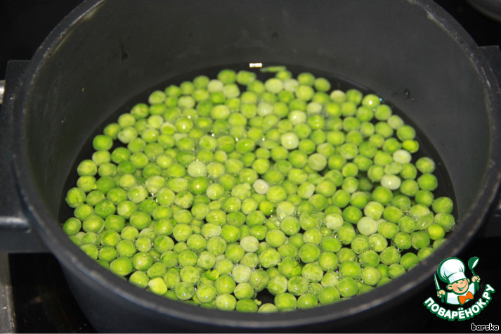 Замороженный горошек отварить в подсоленной воде 3 мин.