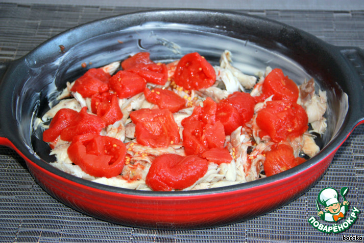 Помидоры в собственном соку вынуть из банки и нарезать крупными кусочками. Выложить на рыбу.