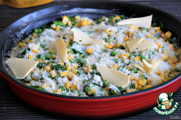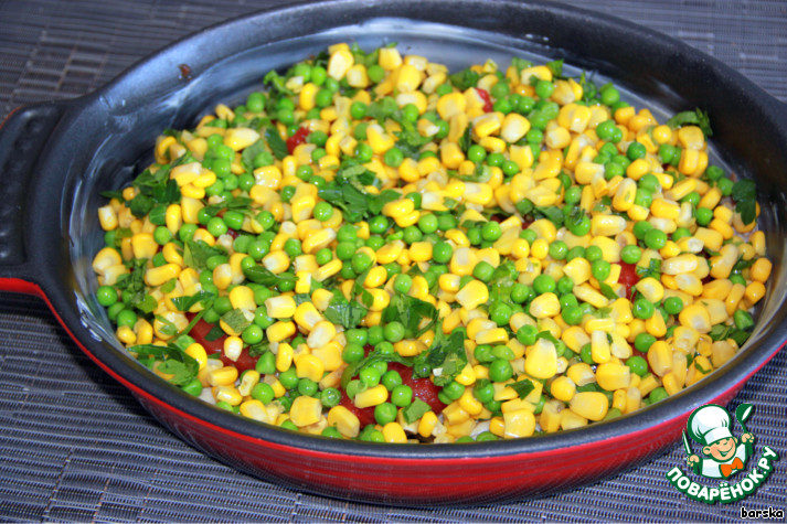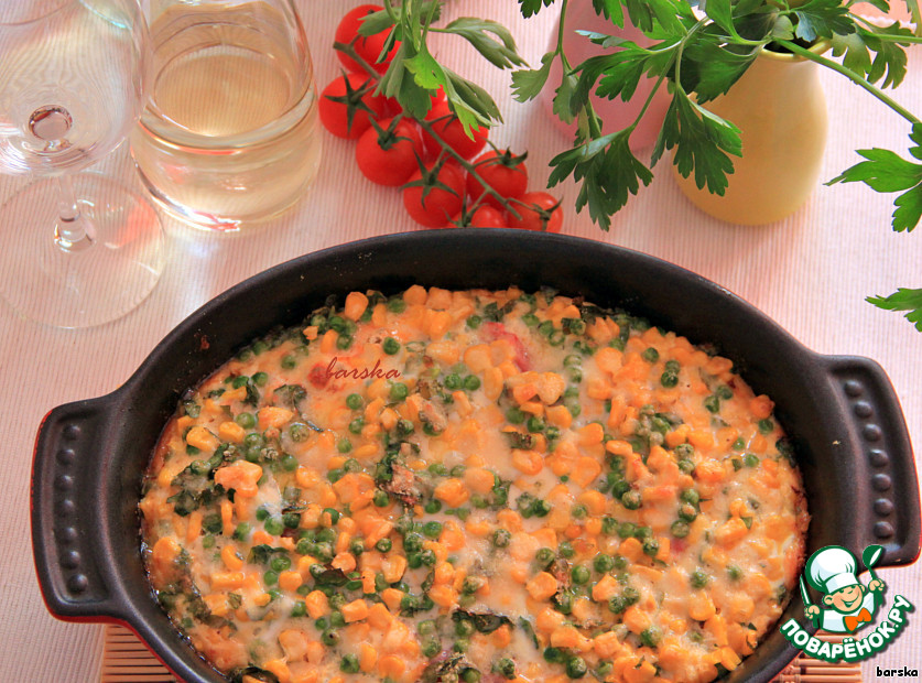 Кукурузу сцедить. Отваренный горошек обдать холодной водой и дать ей стечь. Петрушку мелко нарезать. Смешать кукурузу, горошек, петрушку. Полученную смесь распределить третьим слоем сверху запеканки.