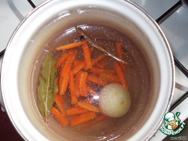 Вскипятить воду, добавить нарезанную брусками морковь, лук, перец, лавровый лист и уксус. Охладить.