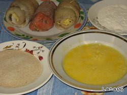 Теперь приступим к жарке. Для этого каждый рулет сначала обваливаем в муке, потом макаем в яйца, затем в панировочные сухари.