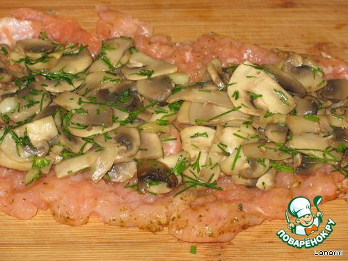 Грибную начинку уложить вдоль филе.