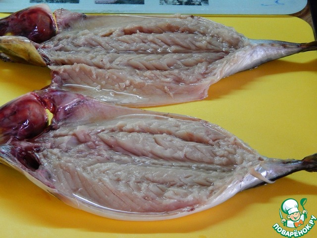 Скумбрию разрезать по брюшку, выпотрошить, удалить хребет, обязательно удалить глаза и жабры, чтобы рыба не горчила.
