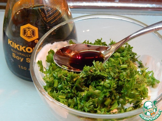 Из зелени, сметаны и соевого соуса приготовить соус.