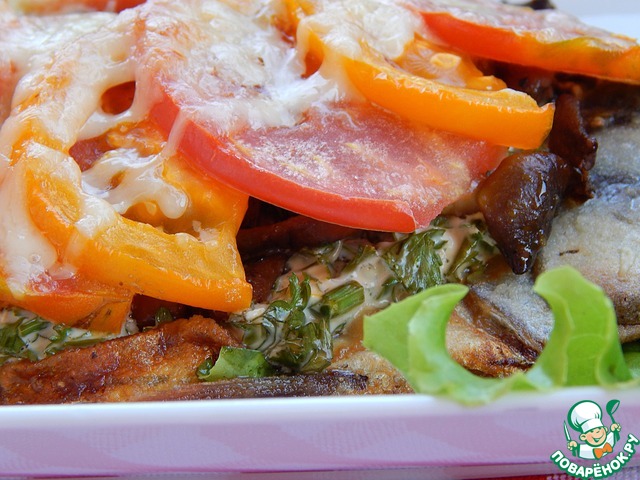 На грибы оставшийся соус, сверху помидоры дольками и сыр. Отправить в духовку на 5-6 минут при темп.200 градусов.