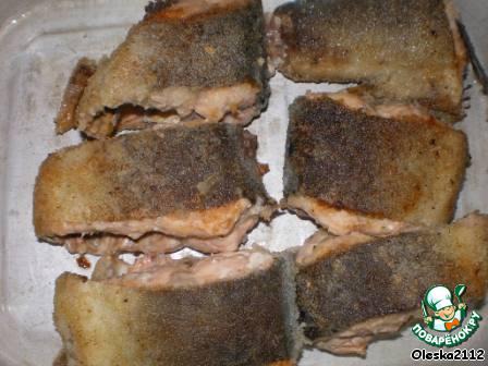 Обжаренную рыбу выкладываем в форму для выпечки.