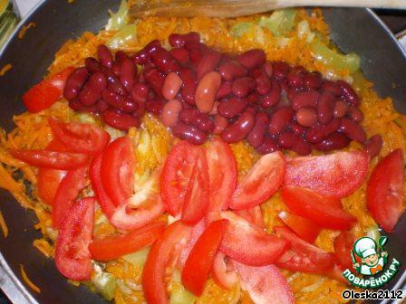 Затем добавляем резанный соломкой перец, помидор - дольками, отварную фасоль, соль, перец душистый горошком, мускатный орех, лавровый лист и томат.