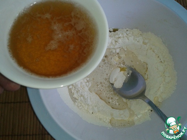 Вливать в муку пиво, замешивая тесто.