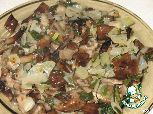 Лук мелко нарезать, обжарить на растительном масле, добавить промытые грибы и зелень и потушить минут 5.