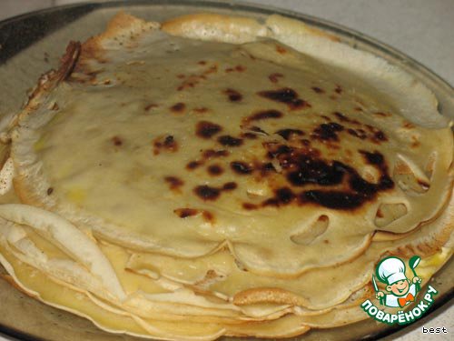 Постепенно вливаем молоко и минеральную воду, продолжая размешивать. Добавляем растительное масло. Печём тонкие блинчики (должно получиться штук 15-17). Каждый блинчик смазать маслом.