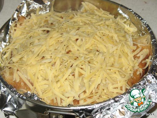 Когда закончите, закрыть свесившимися краями блинов наш торт и посыпать сверху тертым сыром.