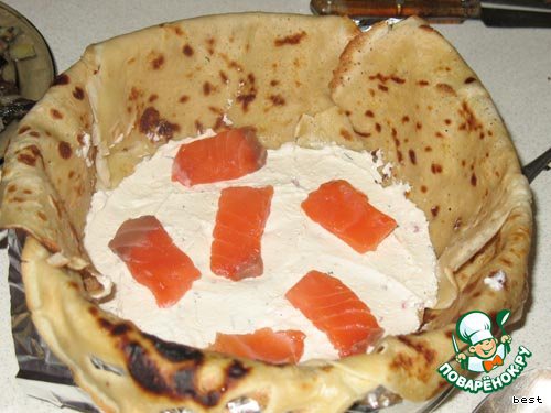 Разъемную форму смазать маслом, выложить внахлест 5 блинов, чтобы часть блина свисала из формы. На низ положить блин, который будет служить основой.