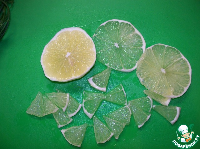 Лимон-оставшуюся половинку, аккуратно нарезаем.