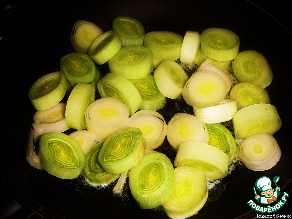 Обжариваем лук-порей на оливковом масле до золотистого состояния (он должен немного размягчиться).