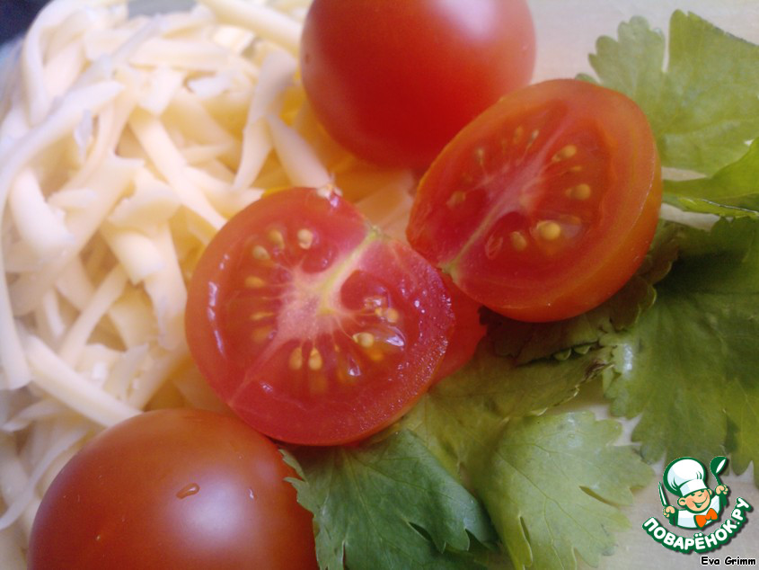 Сыр натрем на крупной терке, томаты разрежем пополам и приготовим листики петрушки