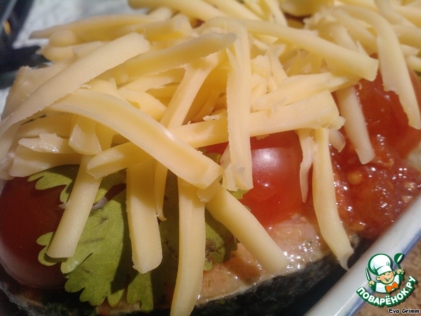 Перекладываем рыбку на овощи, сверху укладываем половинки томатов