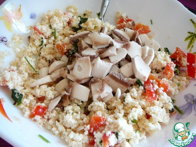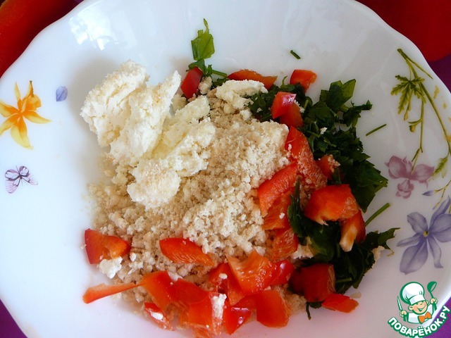 Смешать творог, петрушку, перец, хлебные крошки.