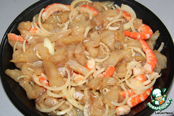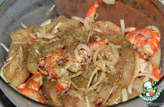 Смешаем рыбу, креветки и лук. Все приправим зеленью и специями.