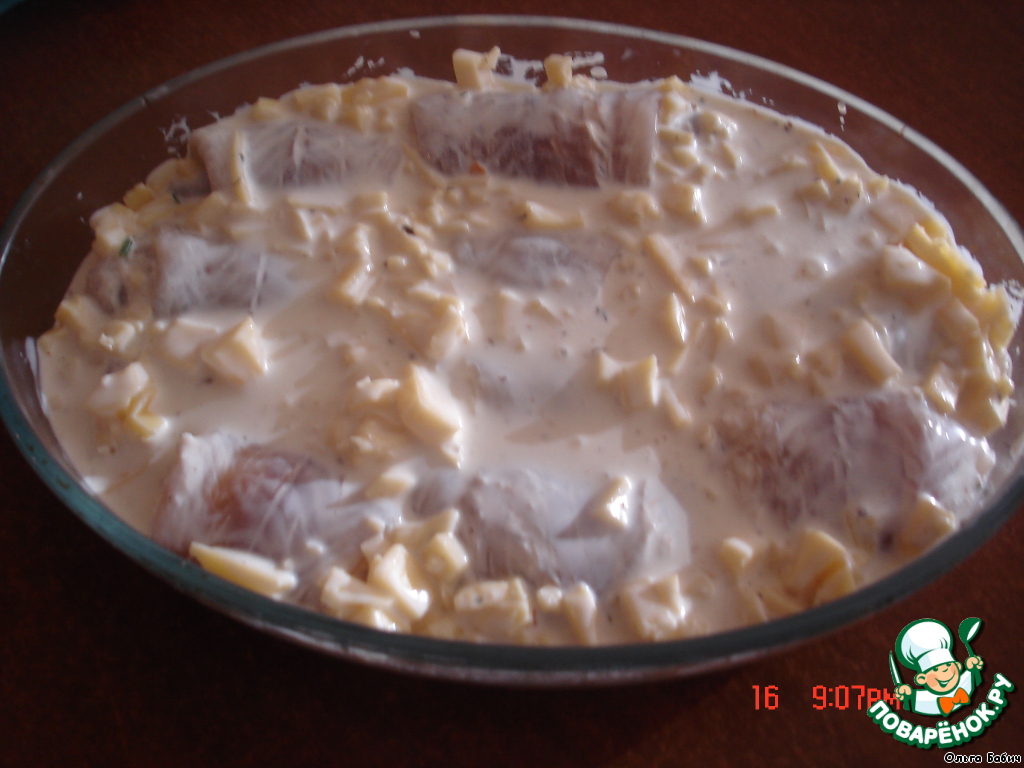 Рулеты сложить в форму и залить соусом. Взбить сливки с чесноком, пропущенным через пресс, добавить специи и сыр, порезанный кубиками.