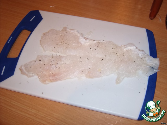 Теперь займемся рыбой. Если филе окуня слишком толстое, как было у меня, то отбить его слегка до толщины примерно в 1 см. Разрезать каждое филе вдоль пополам. Посолить и поперчить.