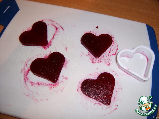 В кастрюльке нагреть маринад из уксуса, 50 мл воды и сахара. Положить туда сердечки из свеклы.