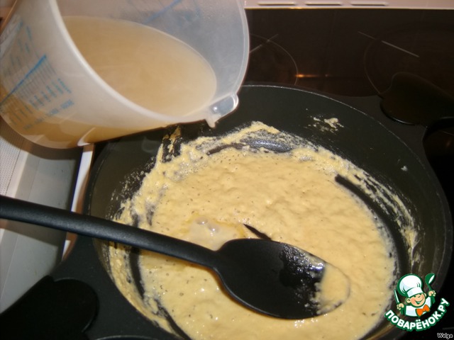 Затем постепенно, помешивая, вливаем бульон, лучше всего использовать венчик, чтобы не допустить образования комков.