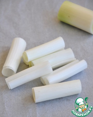 Лук-порей должен быть свежим и молодым. Нарезать его длиной 7-10 см. Разрезать продольно.