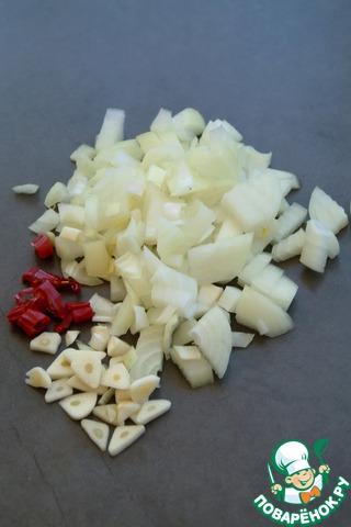Обжарить лук до золотистости, натертую на терке морковь. В конце приготовления добавить чеснок и перчик острый. Добавить рыбу, обжарить, добавить рис. Посолить, поперчить черным молотым перцем. Остудить. Добавить яйцо, (если масса рассыпчатая) тертый пармезан, хорошо перемешать до однородной массы.