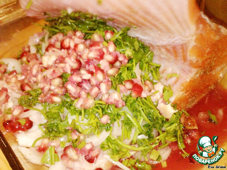В рыбку выкладываем репчатый лук и выжимаем сверху сок от половины зерен граната.