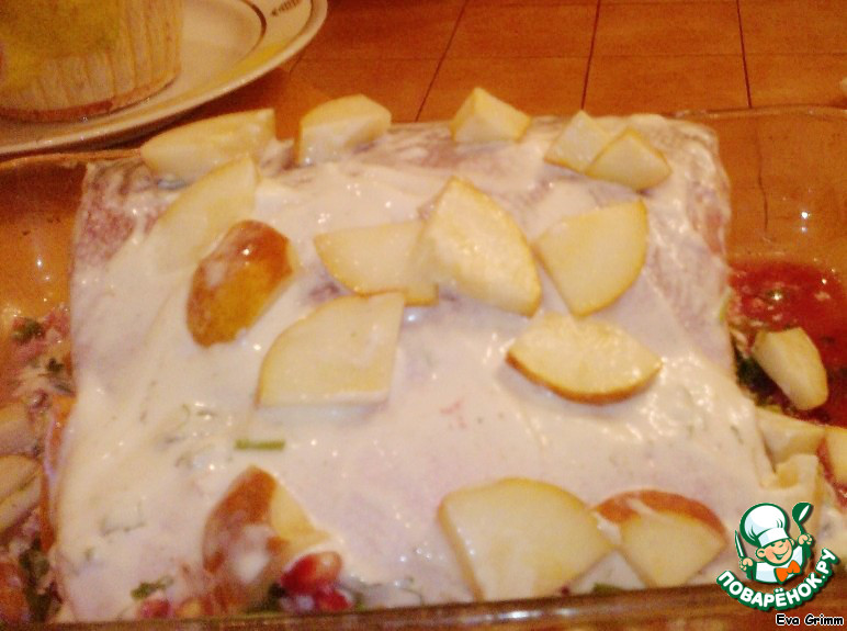 Смазываем сверху рыбку сметанкой (или майонезом), выкладываем кусочки груши (вообще, надо бы помельче нарезать, чем на фото, так вкуснее что ли)...