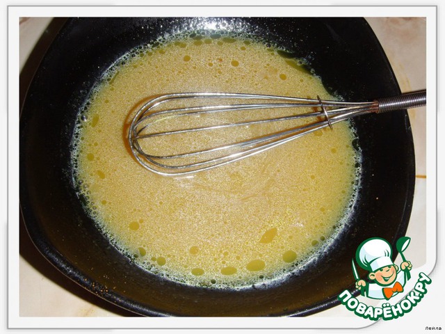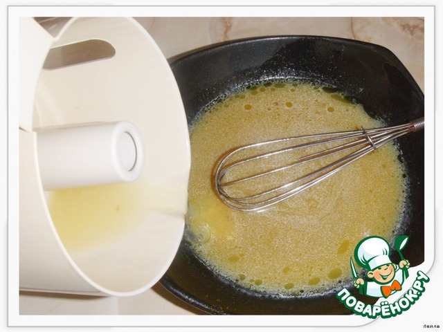 Мешая, развести желтки этим соусом. Добавить ещё горячего соуса из кастрюли - непрерывно помешивая. ( Этот приём называется уравниванием температур и предотвращает сворачивание желтков в горячем соусе).